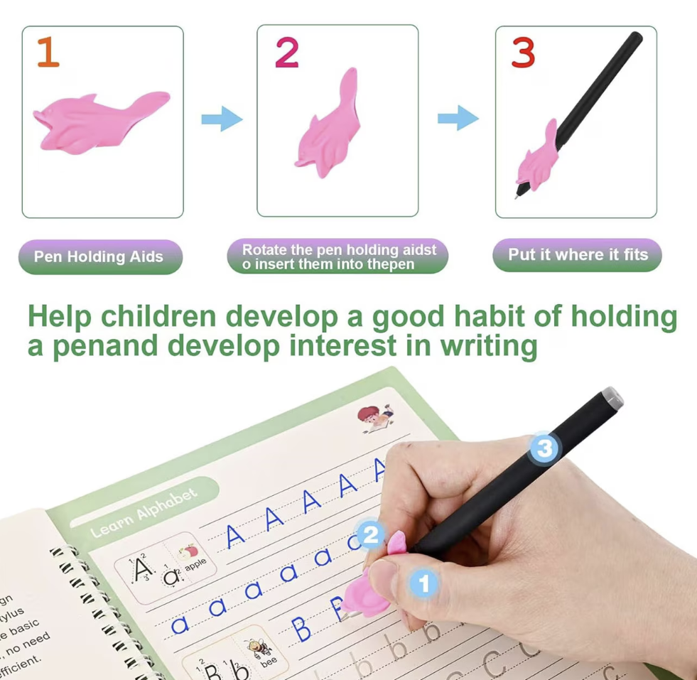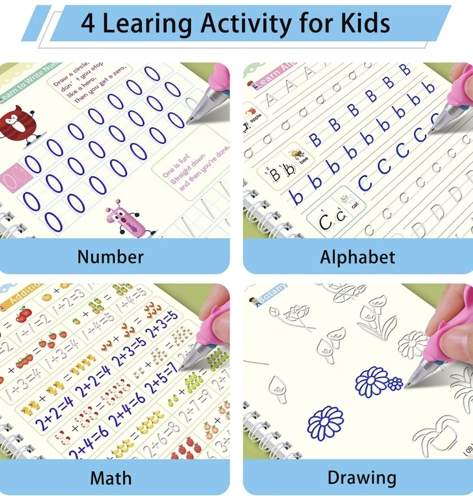 Cartea de practica a scrisului pentru copii este mult mai mare decat alte copybook-uri de pe piata. pachetul include 4 carti de lucru pentru scrisul de mana (Matematica,Numar , Alfabet,Desen) + 1 Pixuri + 1 manere de creion pentru scrisul de mana al copiilor + 5 rezerve.