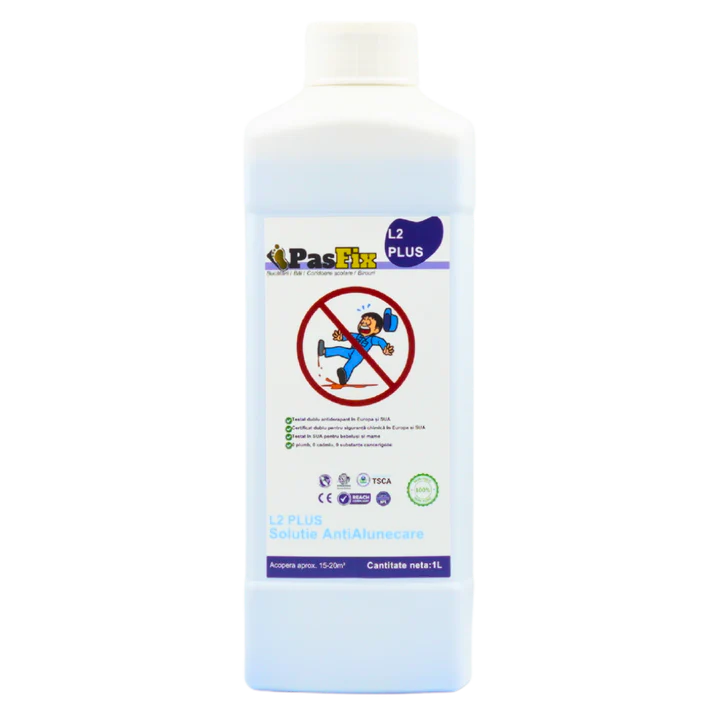 PasFix L2 PLUS 1L este o soluție antialunecare profesională, recomandată pentru băi, bucătării, birouri și coridoare școlare. Testată și certificată în Europa și SUA, soluția oferă protecție sigură și eficientă împotriva alunecărilor, fiind 100% non-toxică și prietenoasă cu familia și mediul.